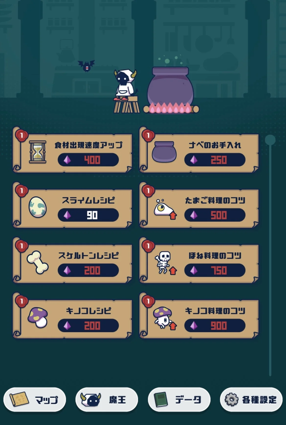 モンスター進化レベルや攻撃力、食材の発生時間の短縮などを強化しなければ、ステージをクリアすることができなくなってきます。