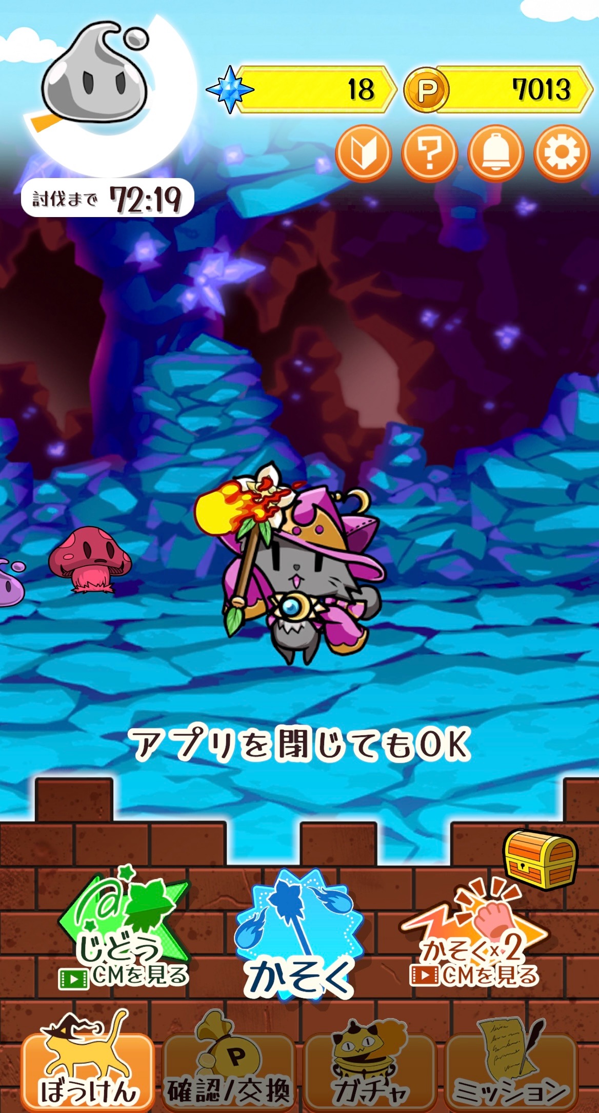 魔法使いにゃんこにダンジョンへ冒険に出てもらい、一定時間が経って冒険から帰ってくるとアイテムやポイントがもらえる放置クリッカーゲームです。