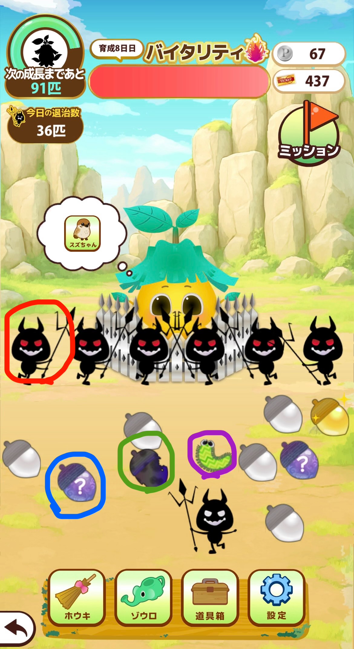 また、あまり長く放置するとゲジーにせっかく落ちた木の実をかじられてしまうので、やはりちょこちょこアプリを開き、ゲジーが出てきていないかの確認をする必要がありました。