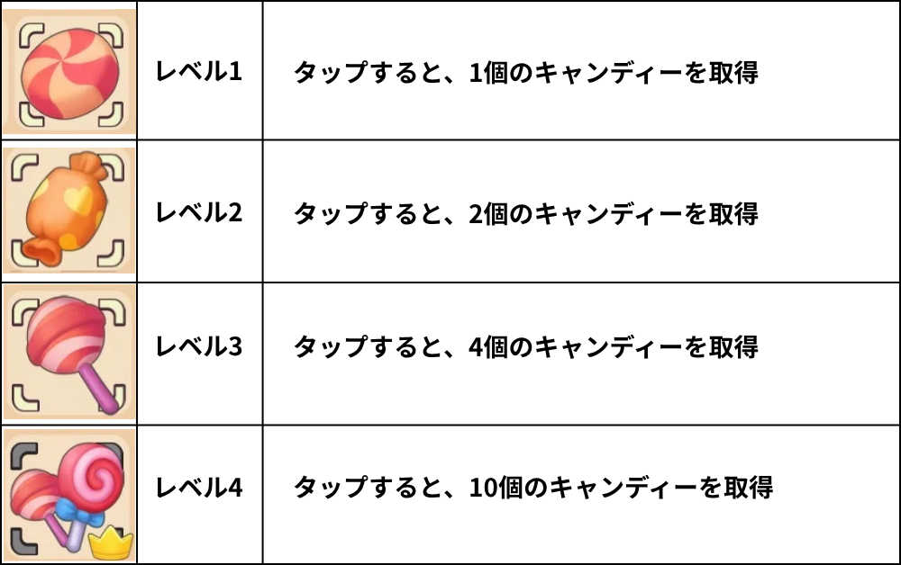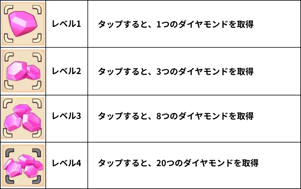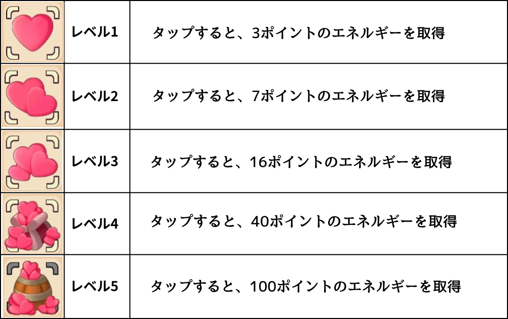 エネルギー、ダイヤモンド、キャンディーのレベル一覧