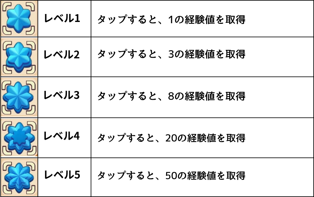 経験値についたは、ストーリーにそって修復することによって獲得するよりも、ひたすらアイテムをタップ&マージして手に入れるが効率がいいと感じました。