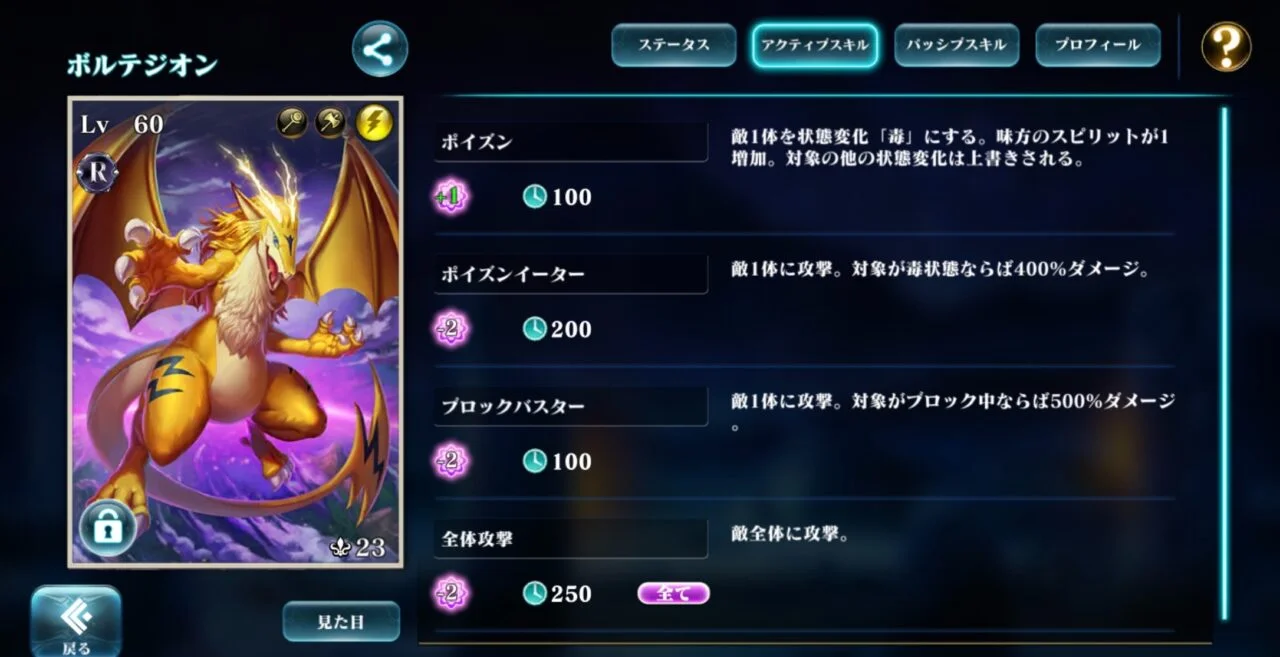 最初に仲間になるビリドラ(画像は最終進化のボルテジオン)は、オンラインでも結構活躍したので、第1幕のうちに育てた方がいいです。毒攻撃は本当に助かりました。