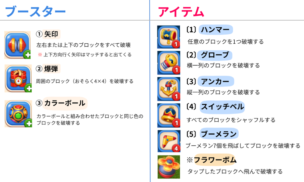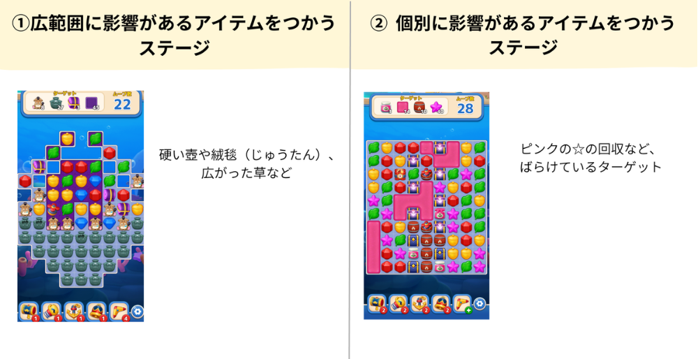 ステージの特性に合わせてブースターやアイテムを使うとクリアしやすくなります。