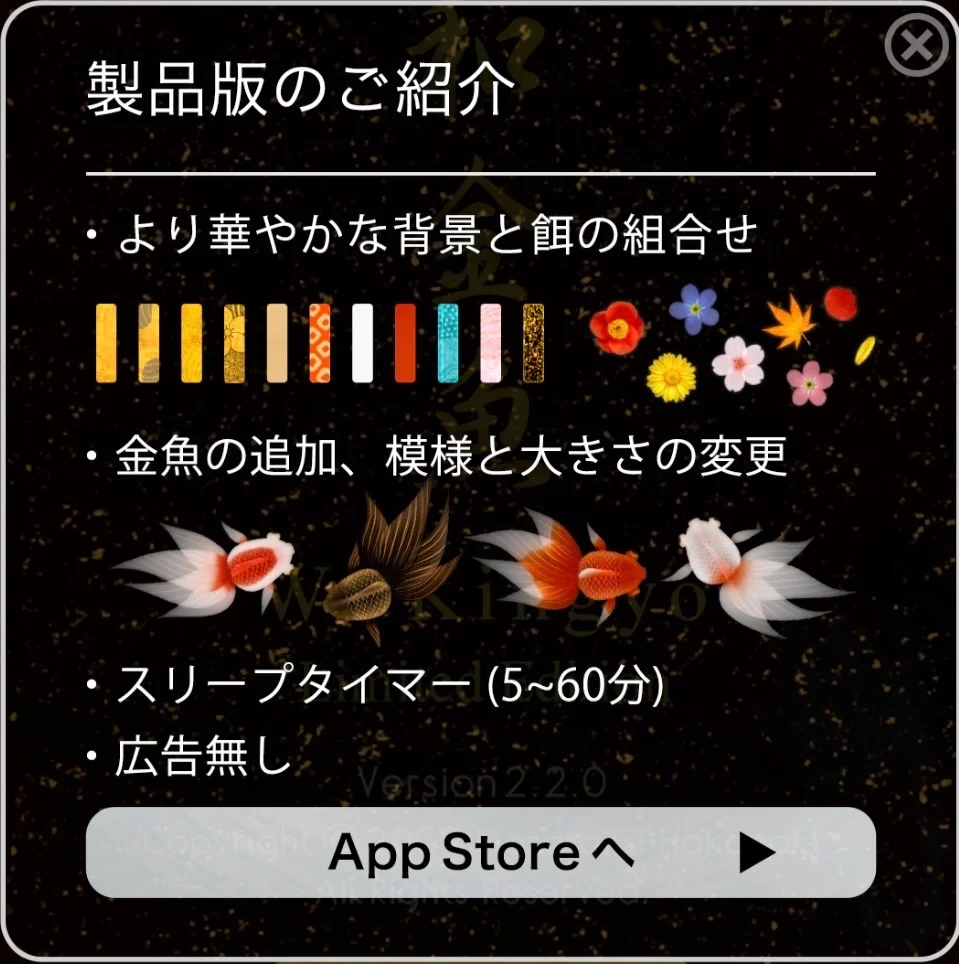このアプリには有料版もあり、こちらは『Wa Kingyo-和金魚-』で販売されています。